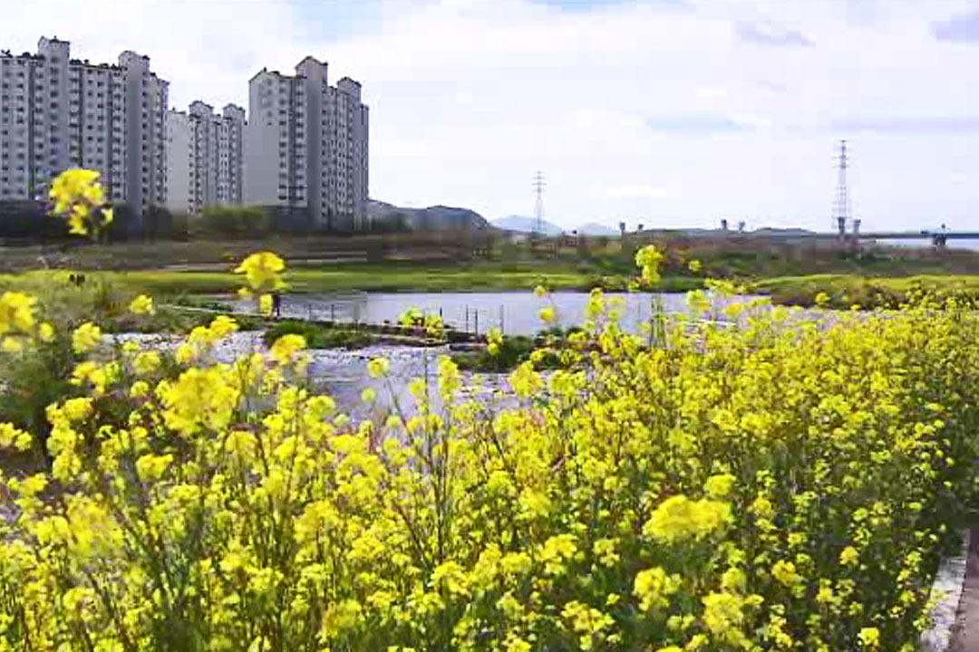 • 하천변 산책로를 따라 길게 띠 형태로 이어지는 노란꽃 군락