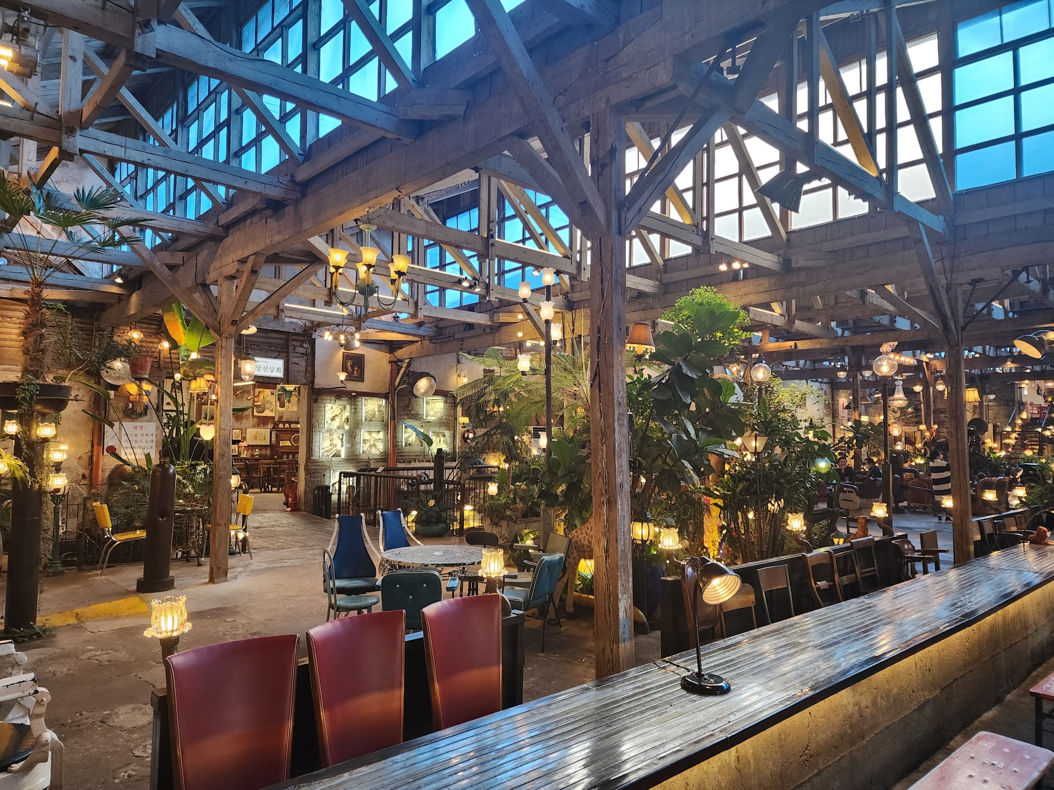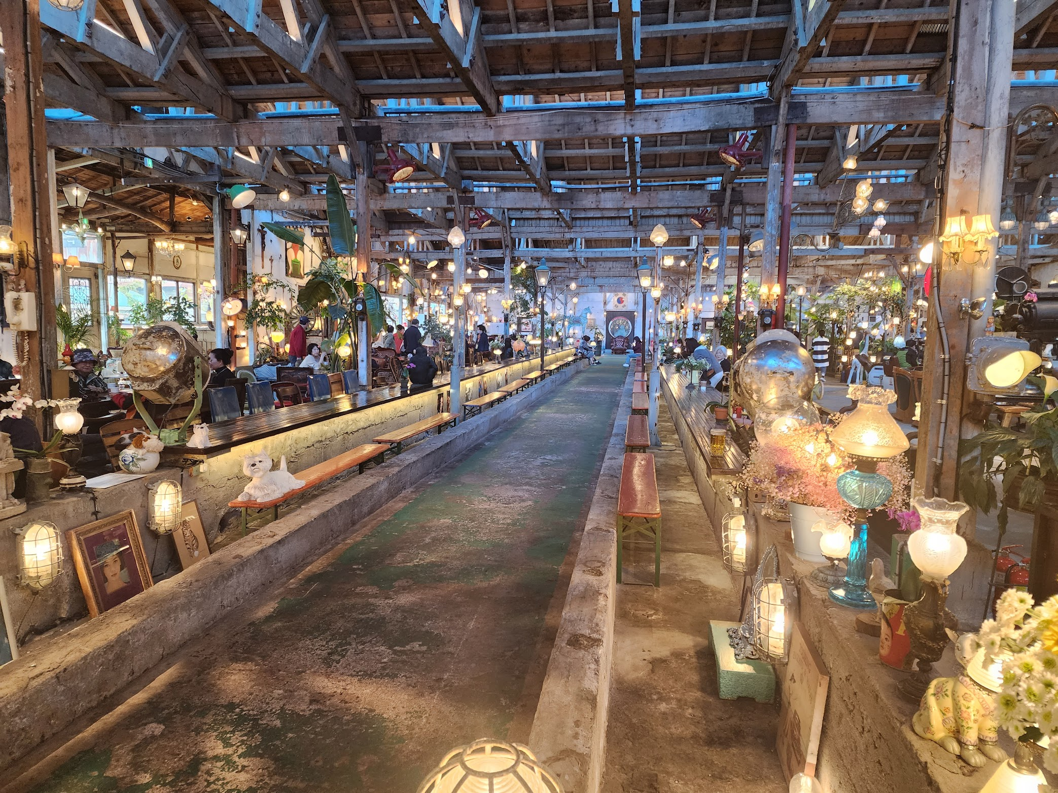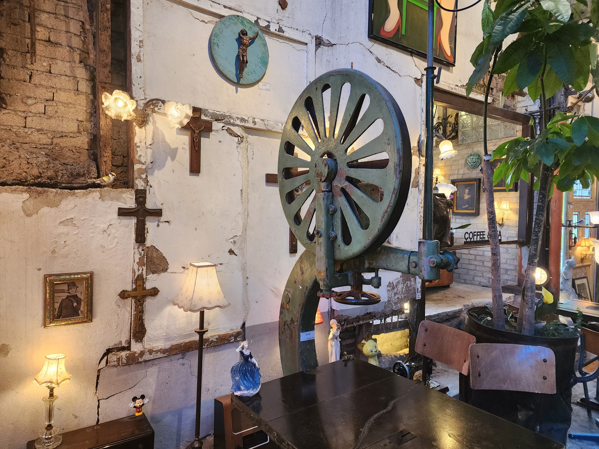 조양방직의 가장 큰 매력은 과거의 흔적을 고스란히 간직하면서도 현대적 감성을 더한 공간 디자인에 있습니다. 과거의 작업대는 커피 테이블로, 오래된 직조기와 공장 설비들은 인테리어 소품으로 활용되었습니다. 또한 공간 곳곳에 배치된 골동품들은 이곳만의 독특한 분위기를 만들어냅니다.