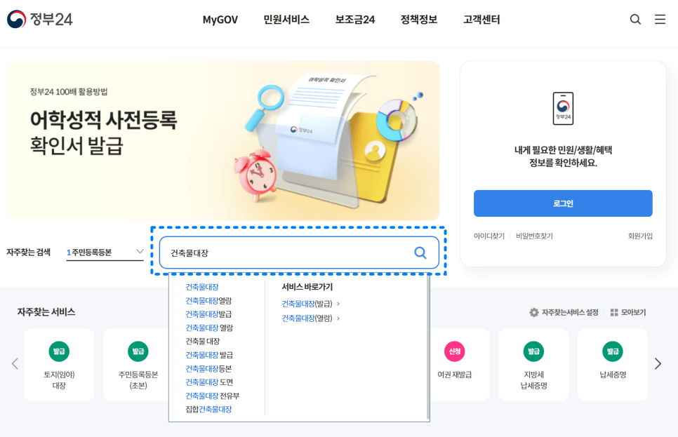 건축물대장을 보려면 검색창에 아래 키워드 중 하나를 입력하는 방식이 가장 빠릅니다.