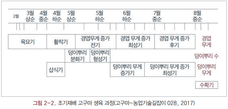 조기재배의 경우에는 2월 무렵 육묘를 시작해 4월 중하순부터 5월 상순 사이 정식하는 흐름을 갖습니다. 반면 보통재배는 3월에서 4월 육묘, 5월 중하순에서 6월 상순 정식이 일반적입니다. 생육 도표를 보면 조기재배는 3월부터 육묘가 진행되고 4월 중순 이후 활착, 5월 이후 덩이뿌리 형성과 비대가 진행되며 8월 전후 수확이 가능합니다. 보통재배는 4월 이후 육묘, 5월 말 또는 6월 정식 후 7월부터 비대가 본격화되고 9월 말에서 10월 초 이후 수확하는 일정이 많습니다. 이 차이는 결국 기온과 지온, 재배 목표에 따라 달라집니다.