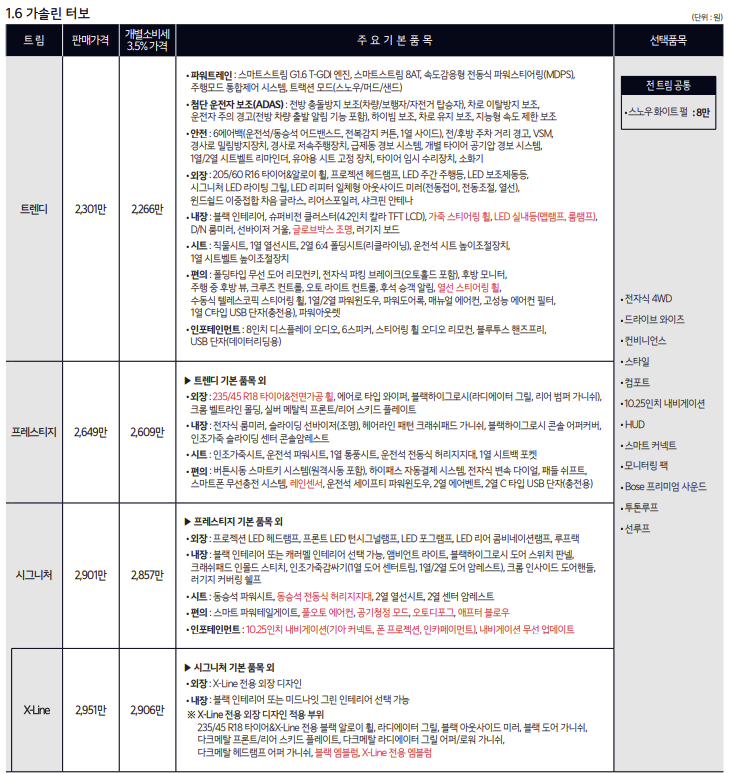 기본적인 구성은 2.0 가솔린 트렌디와 동일하나, 더 강력한 1.6 터보 엔진을 탑재하여 주행 성능을 중시하는 분들에게 적합합니다. - 프레스티지 (2,469만 원)