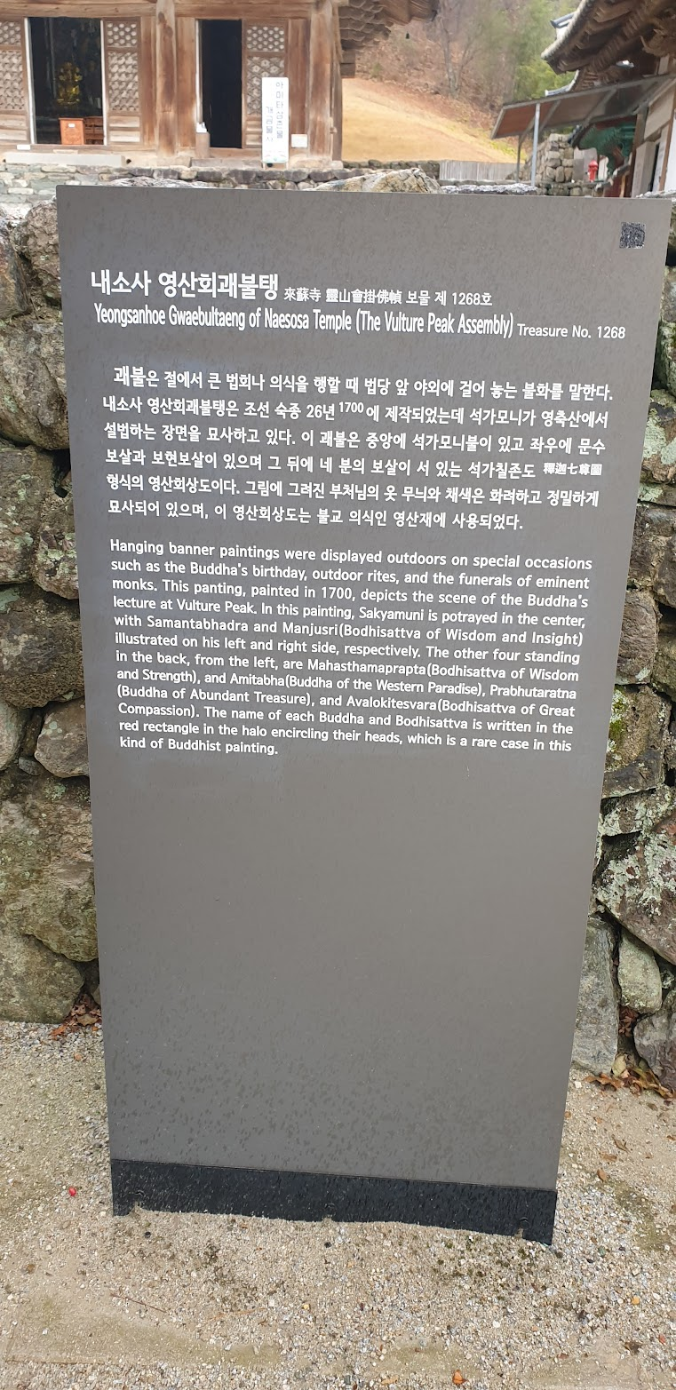 내소사 영산회 괘불탱은 1997년에 보물로 지정되었으며, 그 섬세하고 화려한 그림은 불교 미술의 중요한 예로 손꼽힙니다. 이 괘불탱은 내소사에서 행해지는 영산회 의례에서 사용되며, 불교의 정신과 미술을 동시에 느낄 수 있는 작품입니다.