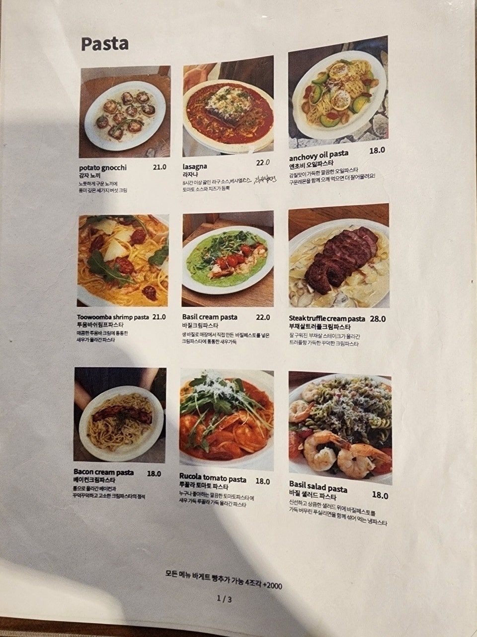 - Basil cream pasta (21.0): 바질 페스토와 크림소스를 활용한 고급 파스타.