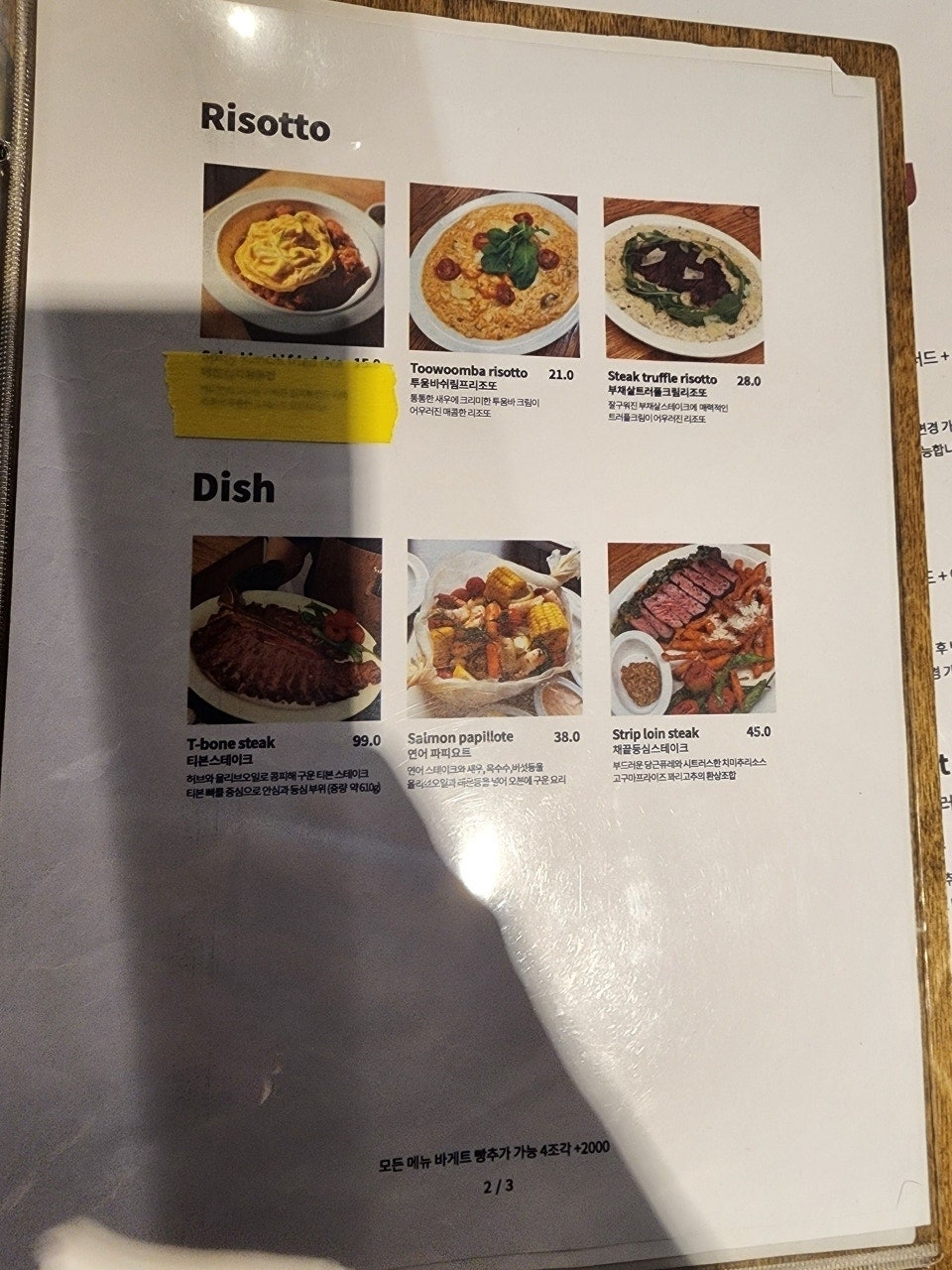 - Steak truffle risotto (28.0): 부채살 스테이크와 트러플 향이 조화로운 고급스러운 리소토.