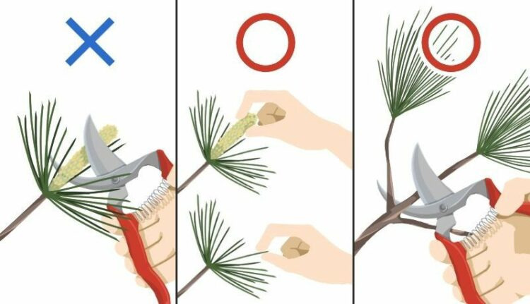 - 남길 가지 선정 기준: 줄기에서의 위치(층 형성), 방향(바깥으로 뻗는지), 각도(완만한지), 건강(침엽 상태), 대체 가지 존재 여부