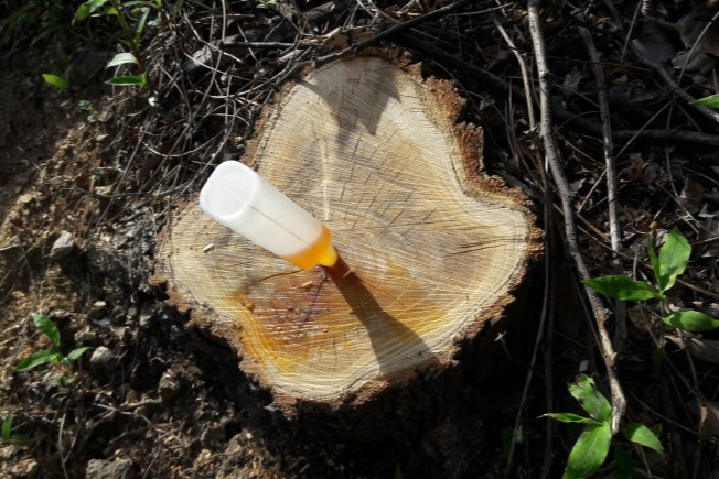 아카시아 줄기를 절단한 후 노출된 조직에 약제가 흡수되도록 처리하는 방법입니다.