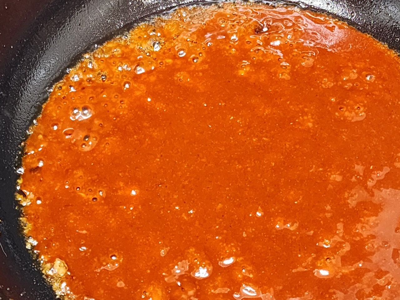 1. 팬에 고추장, 케찹, 간장, 다진 마늘, 꿀, 설탕, 물을 넣고 중불에서 끓여줍니다.
