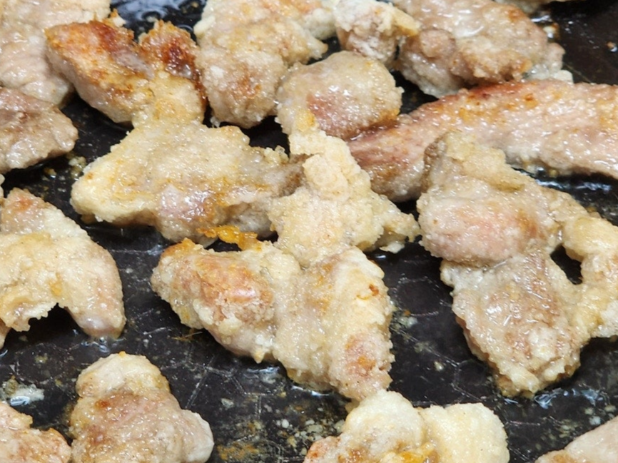 1. 밑간한 돼지 목살에 전분가루를 골고루 묻힙니다.