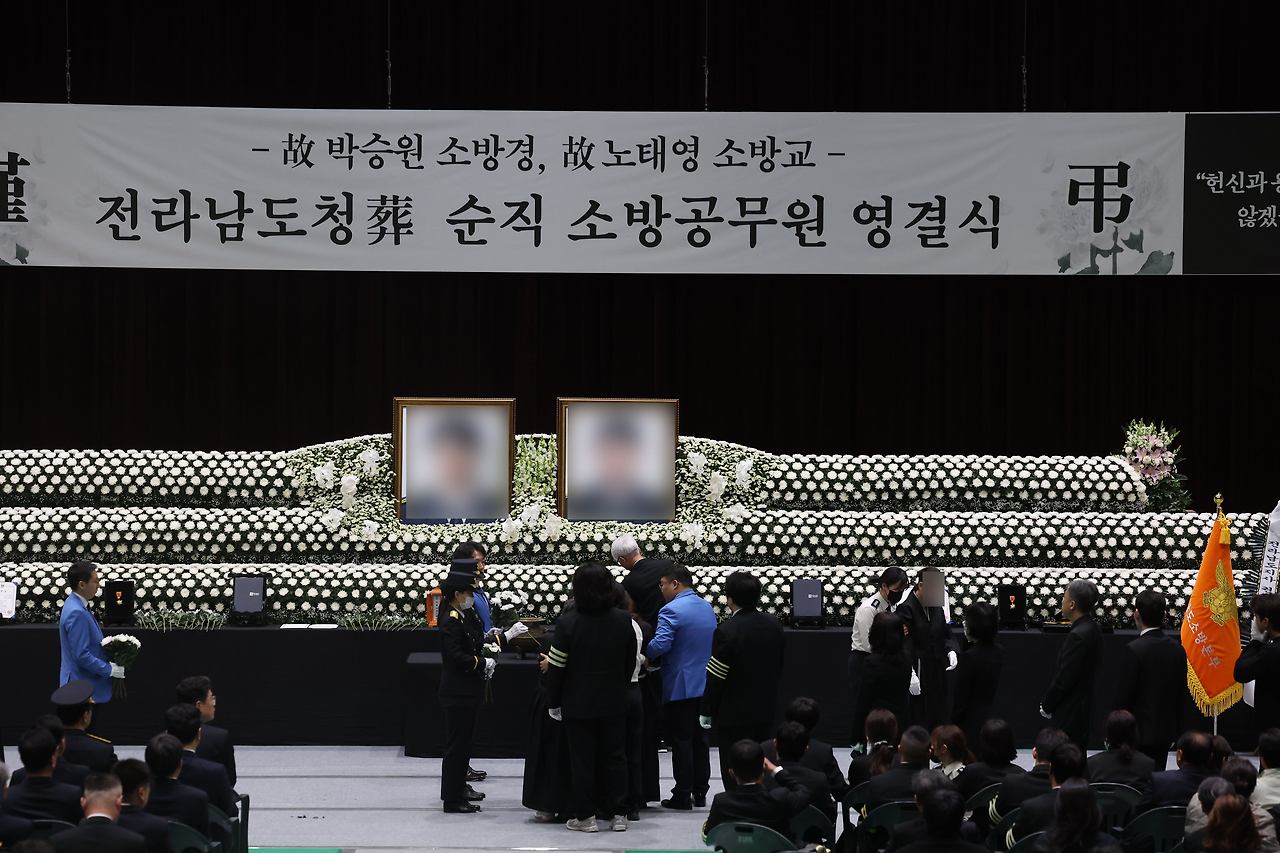 순직 소방관들의 영결식은 전라남도장으로 엄수되었으며, 국가 차원의 예우가 집중된 가운데 진행되었습니다. 영결식은 엄숙한 분위기 속에서 진행되었으며, 동료와 유족들의 깊은 슬픔이 현장을 가득 메웠습니다.