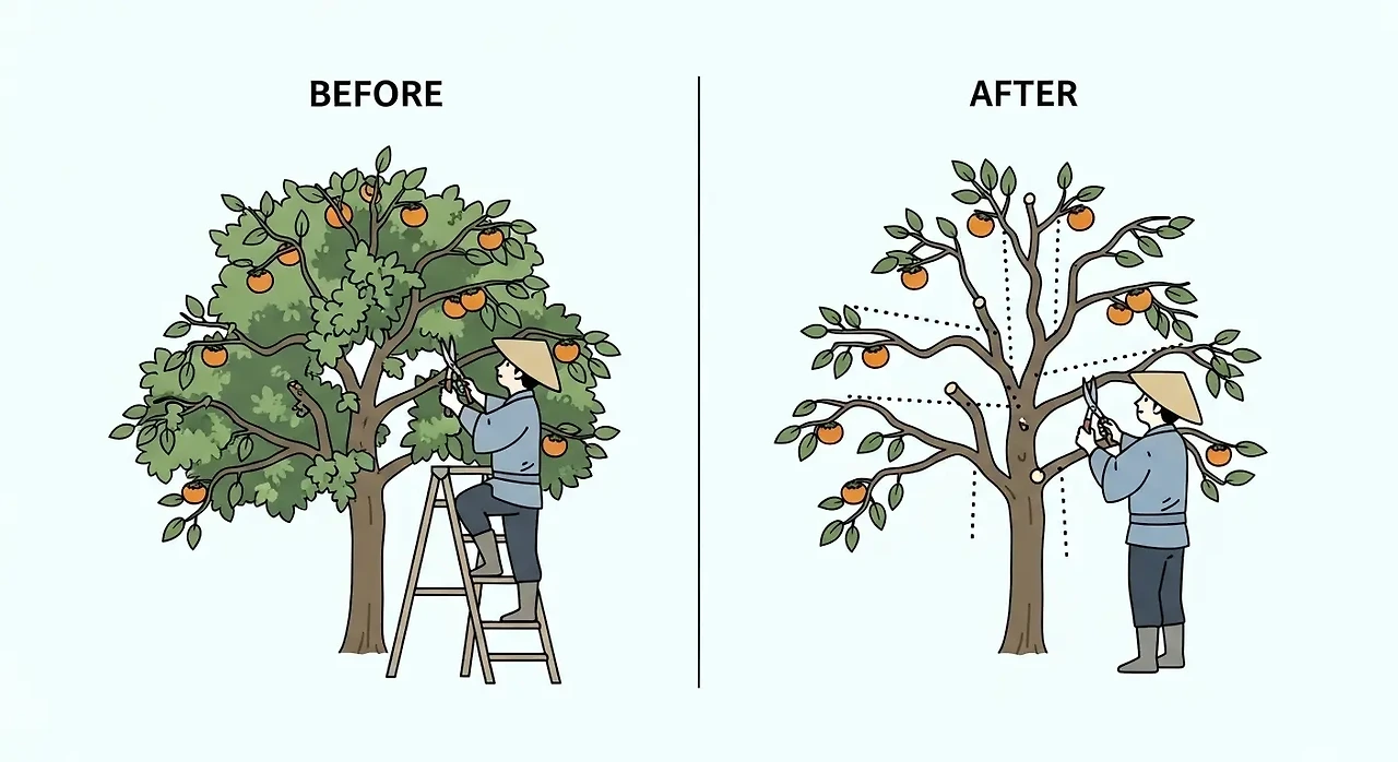 또한 개심자연형 수형을 기반으로 가지를 체계적으로 관리하면 햇빛과 통풍이 개선되어 병충해를 줄이고 과실 품질을 높일 수 있습니다. 무엇보다 중요한 것은 과도한 전정을 피하고 나무의 생육 상태에 맞춰 유연하게 관리하는 것입니다. 꾸준한 전정 관리가 결국 안정적인 수확으로 이어집니다.