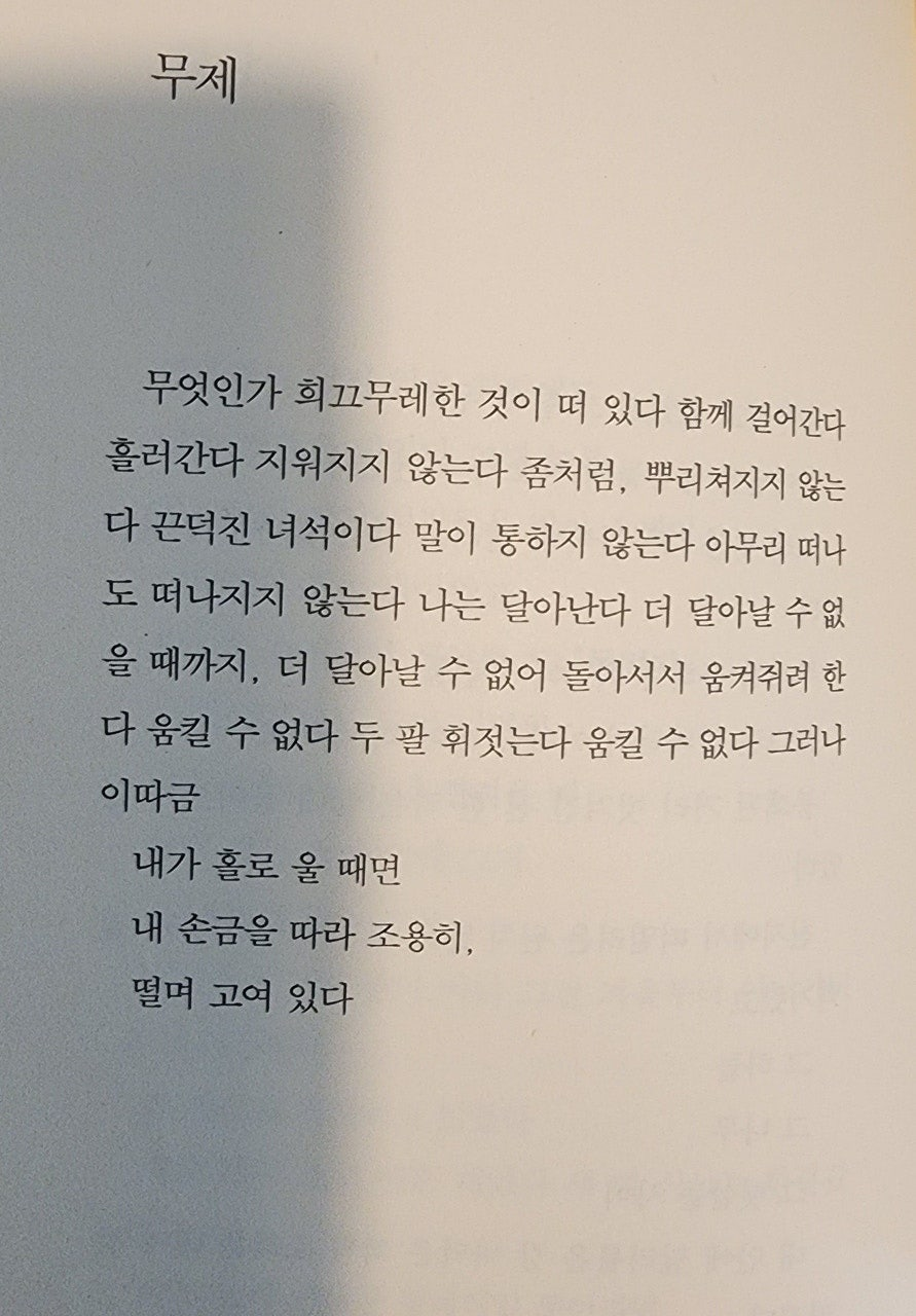 한강 작가님의 서랍에 저녁을 넣어 두었다, 시집에서 개인적으로 가장 좋아하는 시는 [괜찮아]입니다. 유년의 작가가 느꼈을 감정들이 잘 담긴 듯합니다. 어머니는 아이를 달래기 위해 “왜 그래”라는 질문을 반복합니다. 아이는 끊임없이 울고 있습니다. 어머니는 무심코 “괜찮아”라는 말을 건넵니다. 아이는 언제 그랬냐는 듯이 울음을 멈춥니다. 왜 그래,가 아닌 괜찮아. 다독이는 말 괜찮아.로 작가는 우리 모두를 위로합니다.