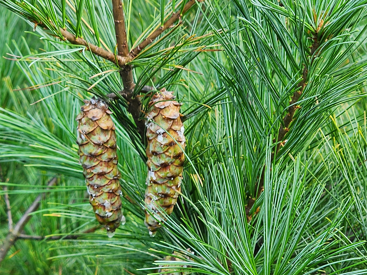 - 식별 포인트: 토종 잣나무 구과보다 길쭉하고 형태가 정돈된 인상을 주는 경우가 많음